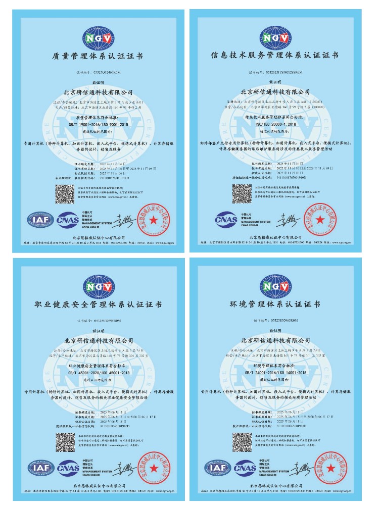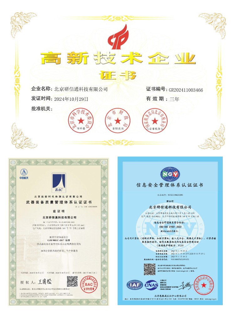 研信通科技通过GJB 9001C-2017质量体系认证全面严格管理和执行,让我们的系统产品均达到GJB150B-86环境试验认证及第三方可靠性认证,达到了高质量标准。我们正在积极筹备多项技术资质认证和军工保密认证。研信通科技产品以高品质、高可靠、高稳定性、高性价比的优势深受广大用户的认同。研信通科技的理念是“科学、严谨、认真、负责”,以卓越的品质和完善的售后,为用户提供放心质量保证的系统产品和满意的服务。